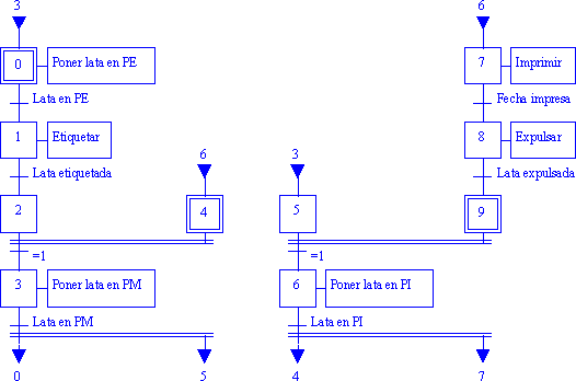 Si nos fijamos en el GRAFCET anterior vemos que para pasar de la etapa 2 a la etapa 3 había una receptividad =1 pero, dado que había un paralelismo, se debía esperar que la etapa 4 estuviese activa. Ahora para pasar de 2 a 3 la receptividad será X4. De la misma manera, para pasar de la etapa 9 a la etapa 6 había una receptividad =1 pero, dado que había un paralelismo, se debía esperar que la etapa 5 estuviese activa. Ahora para pasar de 9 a 6 la receptividad será X5.