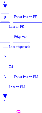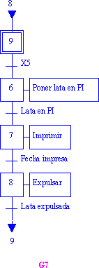 Por lo que se refiere a G5, dado que poner y sacar latas de la plataforma intermedia ya lo hacen G2 y G7, este GRAFCET sólo servirá como memoria para saber si hay o no latas en esta plataforma; entra una lata cuando se activa X3 y sale una cuando se activa X6.