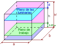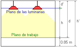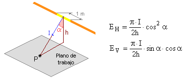 Donde I es la intensidad luminosa de la lámpara en la dirección del punto que puede obtenerse de los diagramas polares de la luminaria o de la matriz de intensidades y h la altura del plano de trabajo a la lámpara.