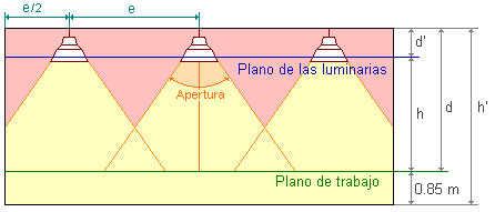 La distancia máxima de separación entre las luminarias dependerá del ángulo de apertura del haz de luz y de la altura de las luminarias sobre el plano de trabajo. Veámoslo mejor con un dibujo: