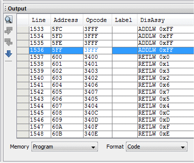 és a dir, els valors que hem posat a const unsigned char LlistaMP[16] encara que, si ens fixem bé, amb els primers dos dígits hexadecimals canviats. El motiu del canvi és que a la finestra s'està interpretant el que es llegeix a la memòria de programa com si fossin instruccions. Però no té cap importància perquè els vuit bits que fem servir sí els guarda correctament.